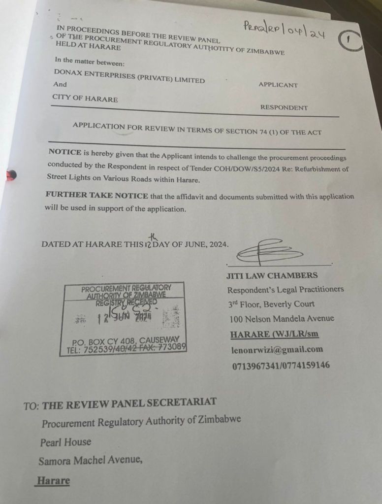 A company by the name Donax Enterprises Private Limited has filed an application to challenge the procurement proceedings conducted by City of Harare. In the documents I have seen and among many reasons it is alleged that the company was not notified of its disqualification or disbarment until the making of procurement awards and there was a failure by City of Harare to reject bids containing information which is materially false or misleading.
